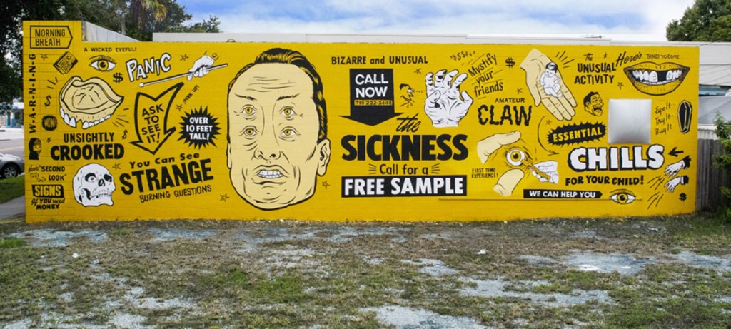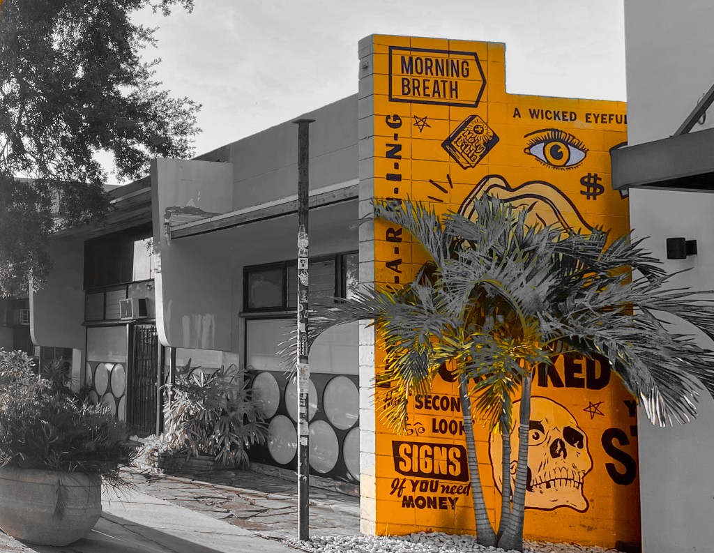 Created in 2015 as part of the SHINE St. Petersburg Mural Festival by Morning Breath, a storefront was built on the lot in the foreground in 2018, leaving the left side of the mural (the denture, the skull and the words “slightly crooked”) visible.